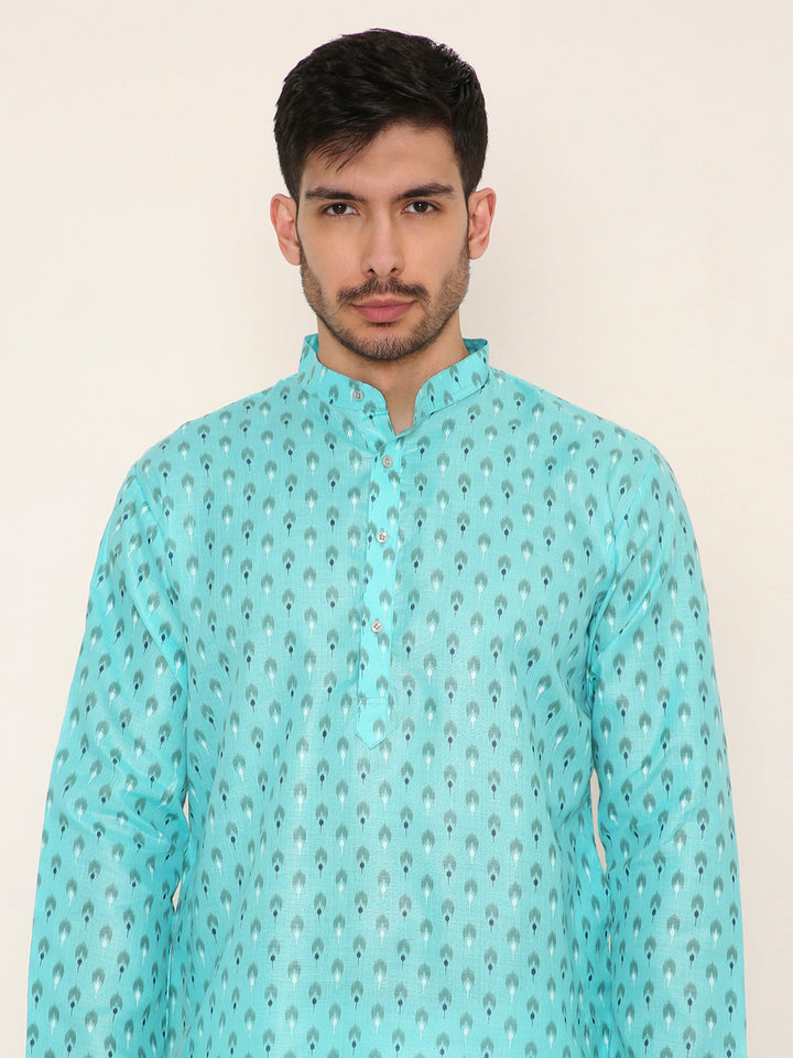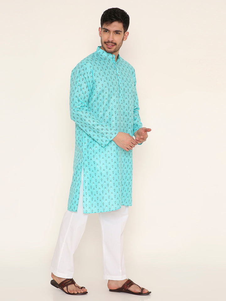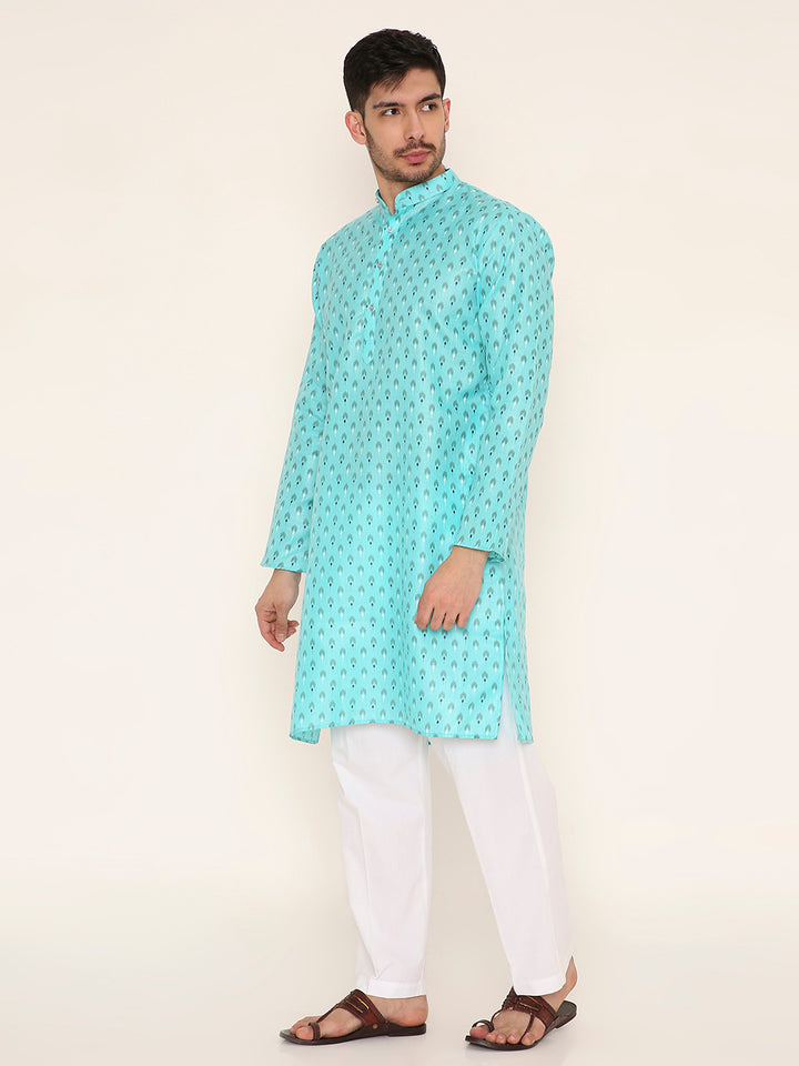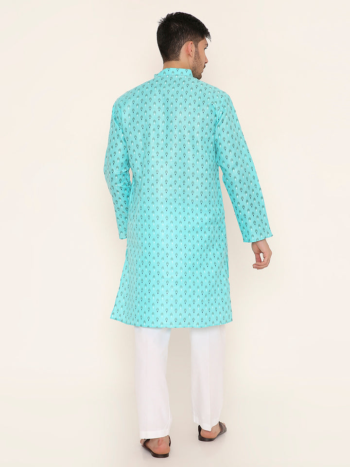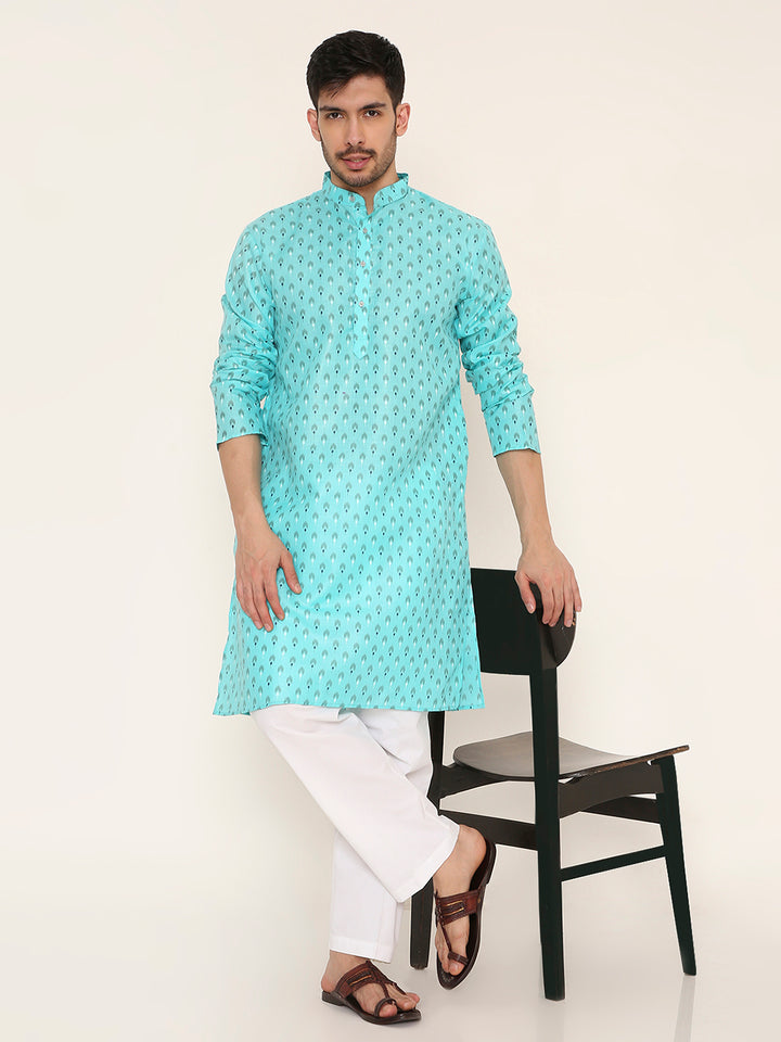 Poly Viscose Regular Fit Traditional Print Design Kurta Pyjama Set in Turquoise