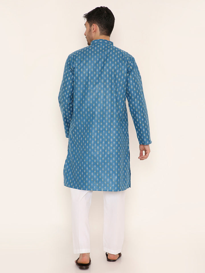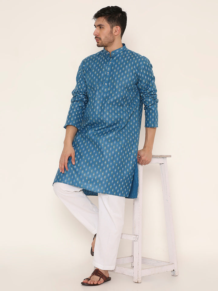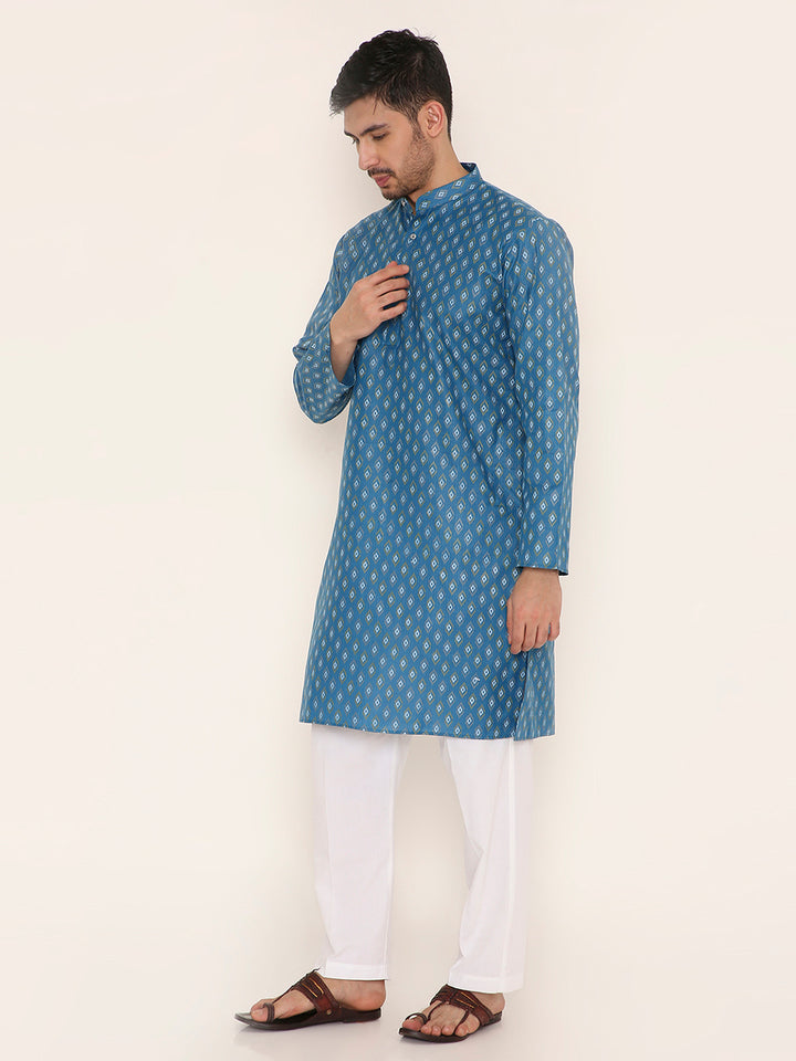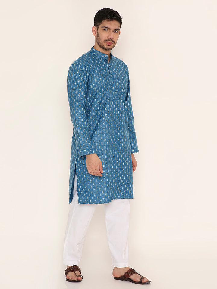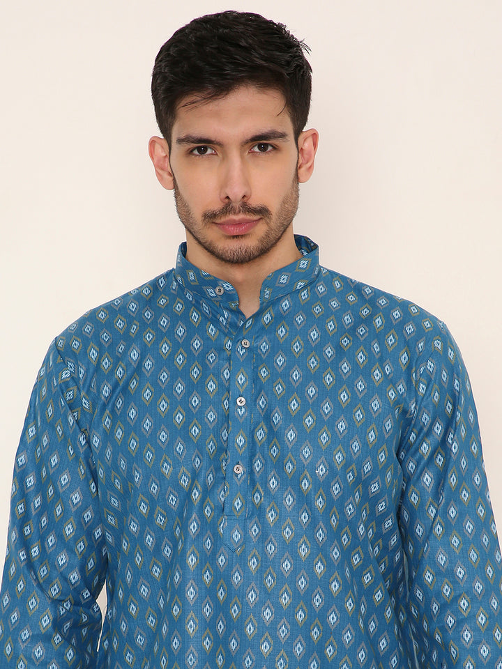 Poly Viscose Regular Fit Traditional Print Design Kurta Pyjama Set in Blue