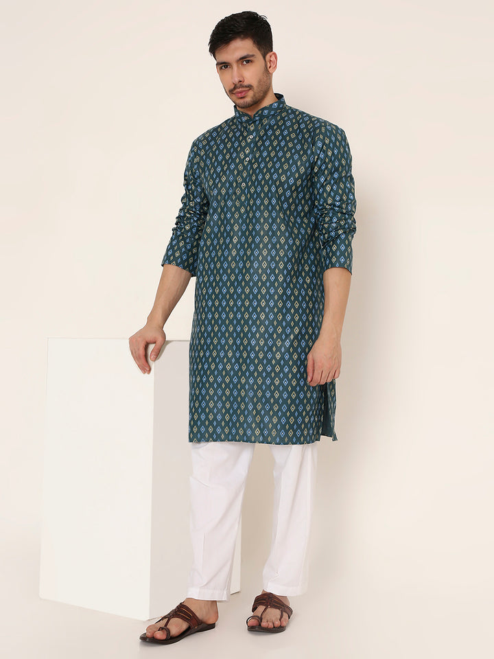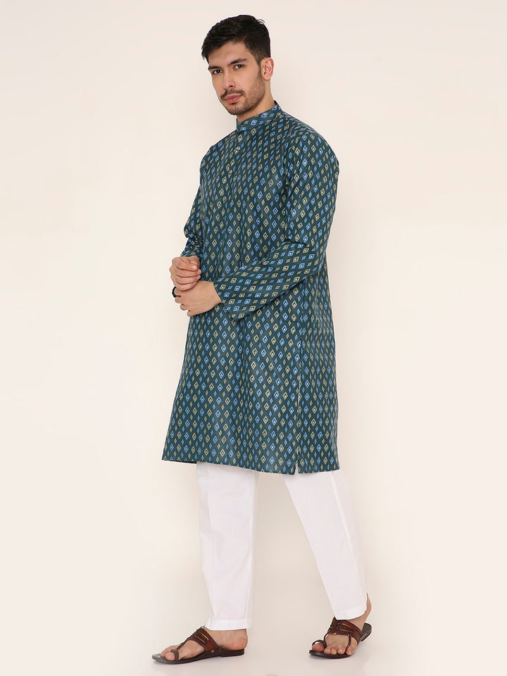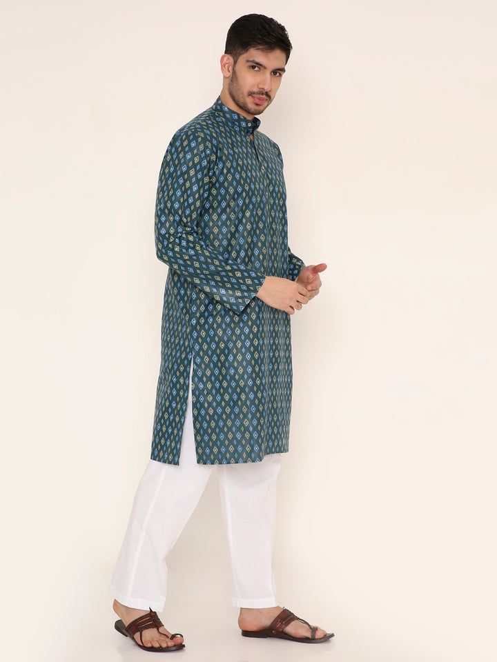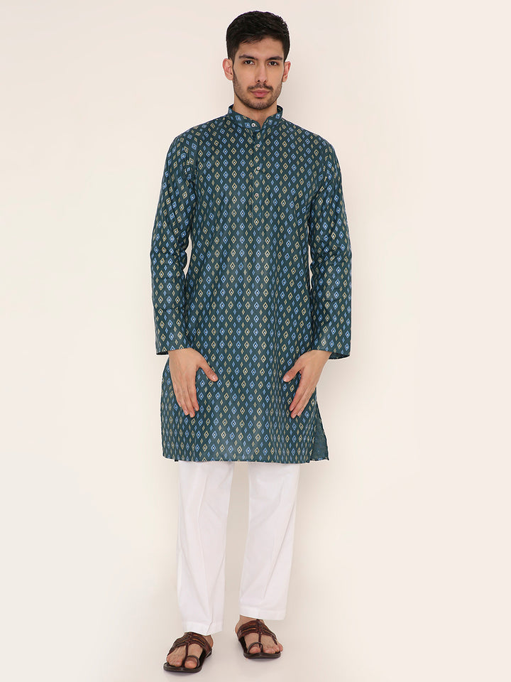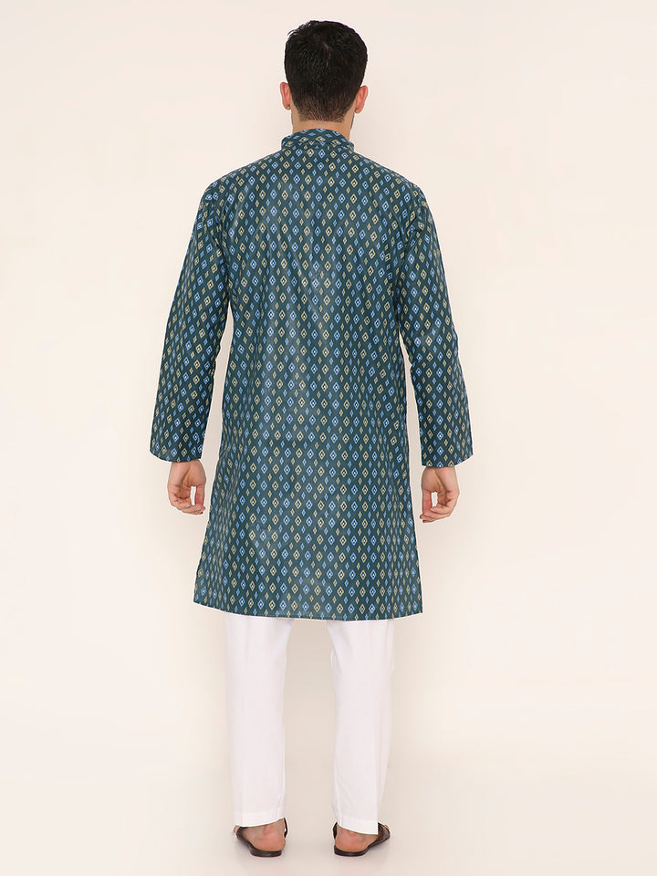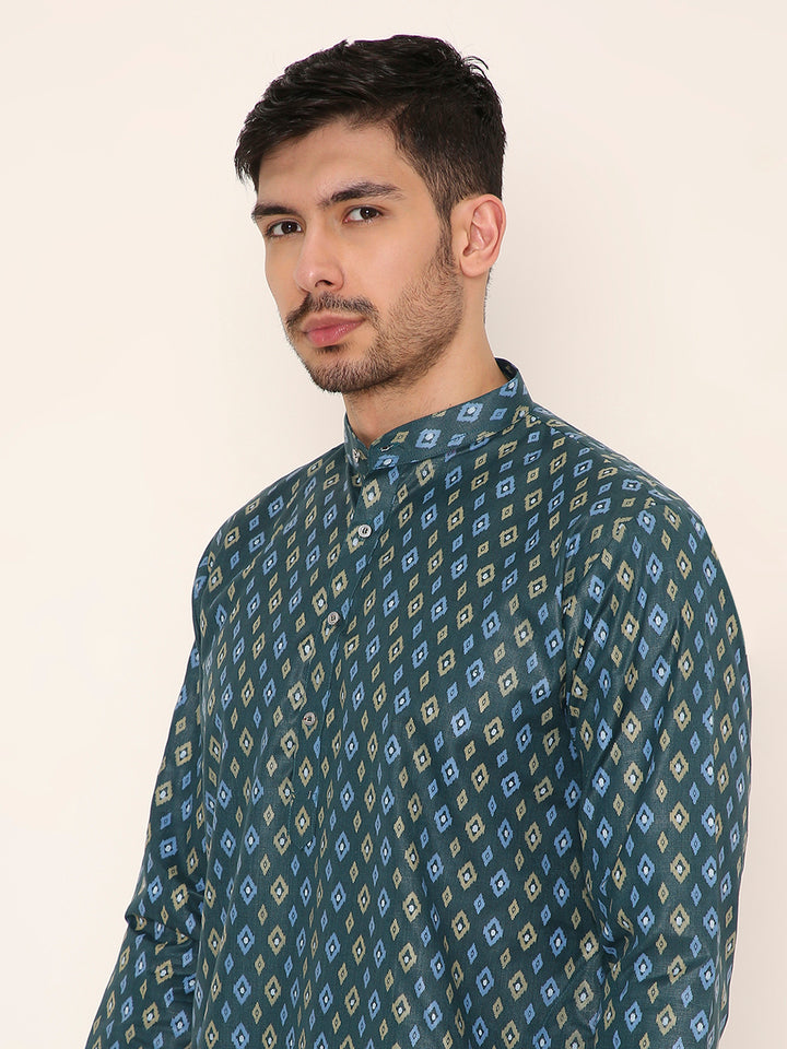 Poly Viscose Regular Fit Traditional Print Design Kurta Pyjama Set in Dark Green